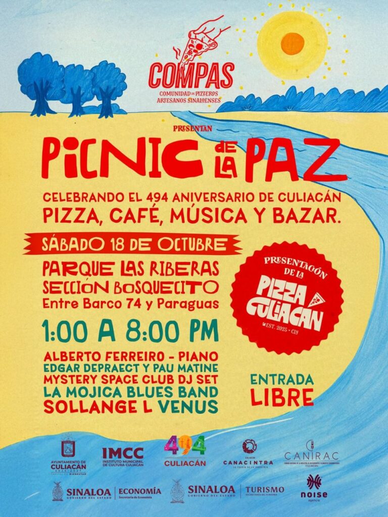 Culiacán, Sinaloa, a 15 de octubre de 2025.- La Comunidad de Pizzeros Artesanos de Sinaloa (COMPAS) invita a las familias culiacanenses a disfrutar del Picnic de la Paz, un evento que se llevará a cabo este sábado 18 de octubre, de 1:00 a 8:00 de la noche, en el Parque Las Riberas, sección El Bosquecito (entre Barco 74 y Paraguas).